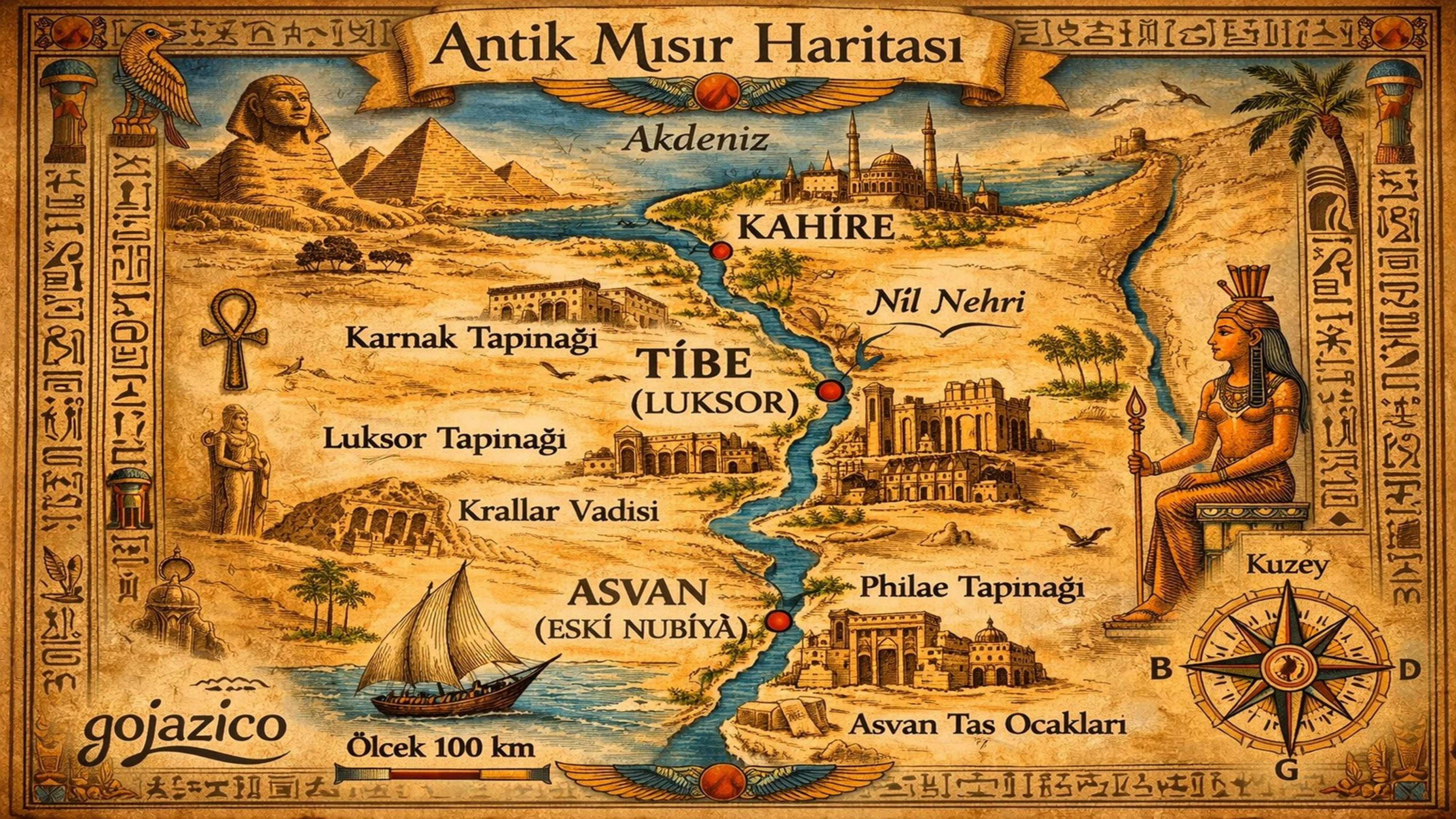 • Karnak Tapınağı • Luksor Tapınağı • Batı Şeria (West Bank) • Krallar Vadisi (Valley of the Kings) • Kraliçe Hatşepsut Tapınağı • Memnon Dev Heykelleri